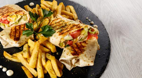 Tortilla de trigo, pollo al curry, salsa de queso casera, patatas fritas y salsa