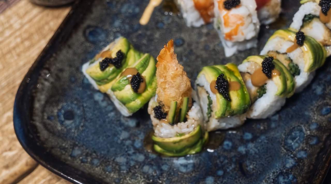 Atún, curatado y hierbabuena, salmón, ají amarillo y yuzu, samachi, crema yakiniku y cilantro, Vieira, tobiko de yuzu