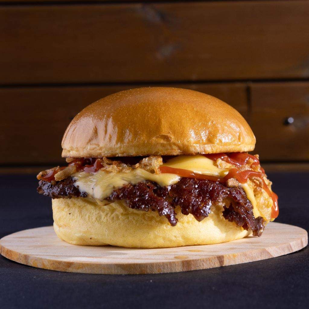 Hamburguesa 100% de ternera, queso cheddar fundido, bacon bites, cebolla caramelizada y mayonesa de bacon.