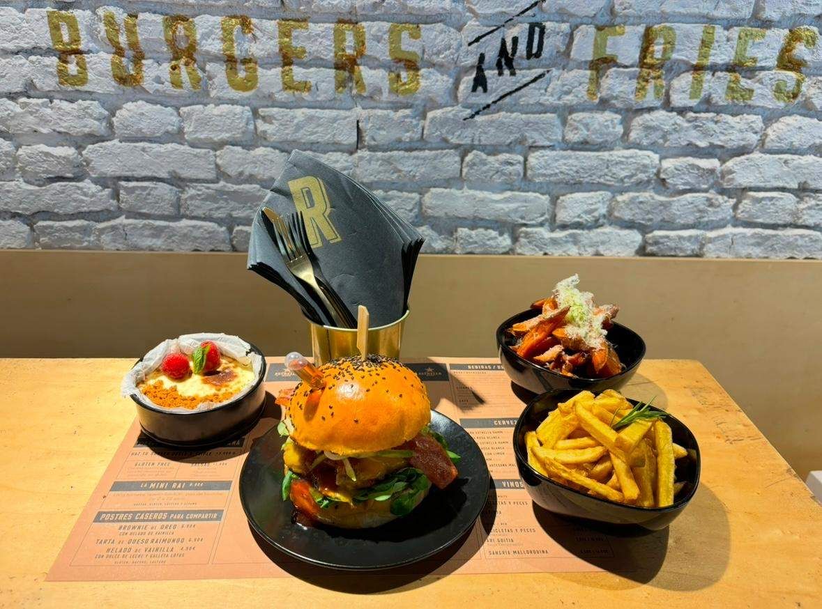 180GR DE PATTY DE PORC NEGRE MALLORQUÍ, ENSAIMADA, MAYONESA ESPECIADA,PEPINILLOS ENCURTIDOS Y MACERADOS, TOMATITOS SEMISECOS EN ACEITE DE OLIVA, CREMOSO DE QUESO DE CABRA, SALSA DE ALBARICOQUE DE PORRERES, BACON CRUJIENTE, QUESO RALLADO DE OVEJA ROJA MALLORQUINA, MIEL DE SOBRASADA Y CRUJIENTE DE PORC.