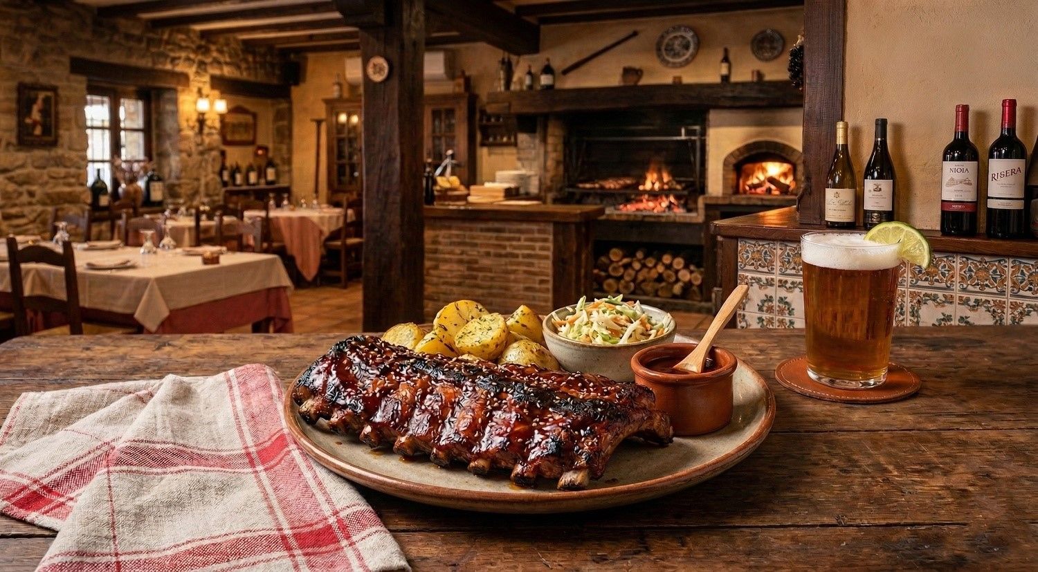Costillar entero de costillas baby back marinado en salsa bbq con patatas fritas y ensalada de col.