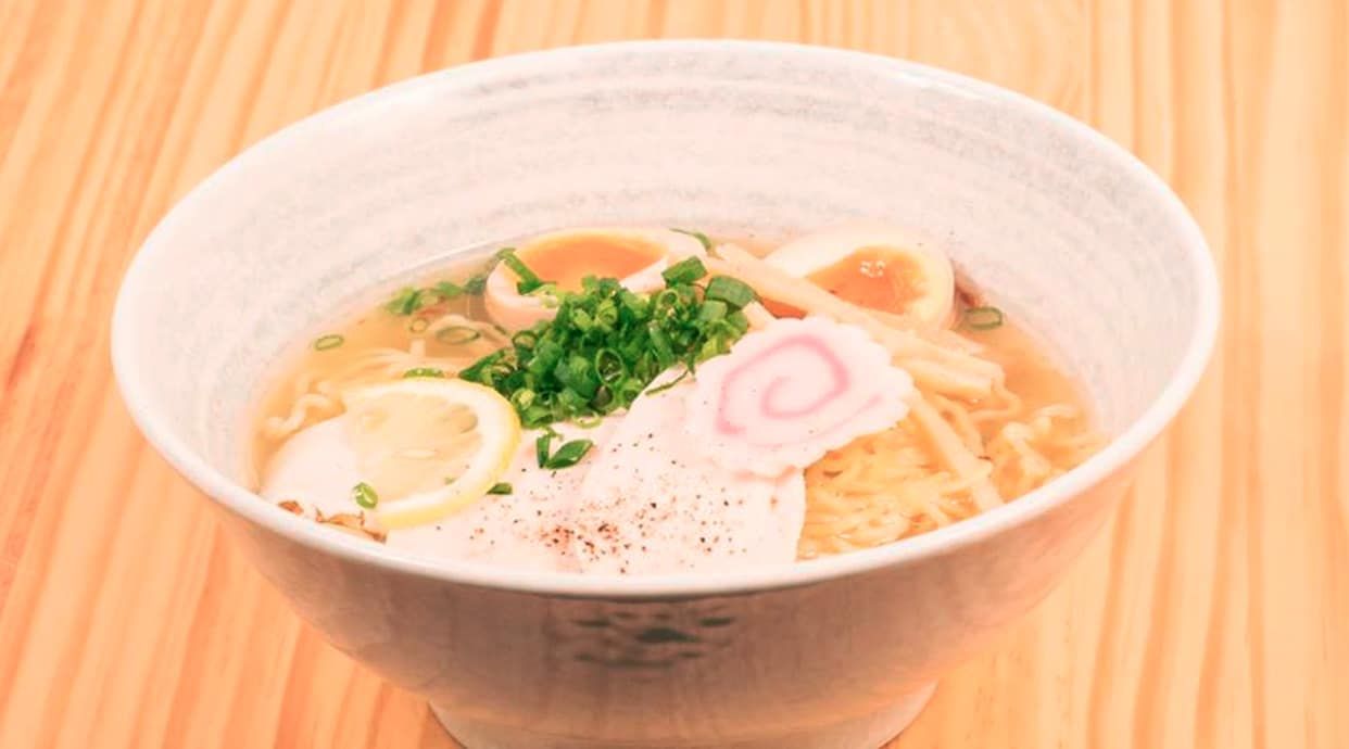 Caldo aromático ligeramente picante hecho con verduras, pollo y cerdo. combinado con cerdo chashu, bambú y cebollino