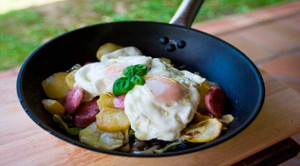 Huevos frescos sobre una cama de patatas, acompañados de chistorra jugosa y pimientos asados