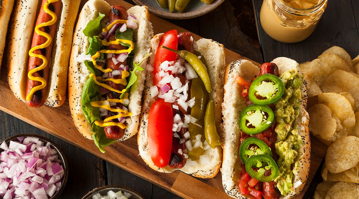 Salchicha, queso, bacon, jamón de York, kétchup, mayonesa, con o sin miel y patatitas crujientes