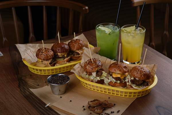 საფირმო მინი ბურგერი კარამელიზირებული ხახვით, ამერიკული ყველით და კიტრის მარინადით.