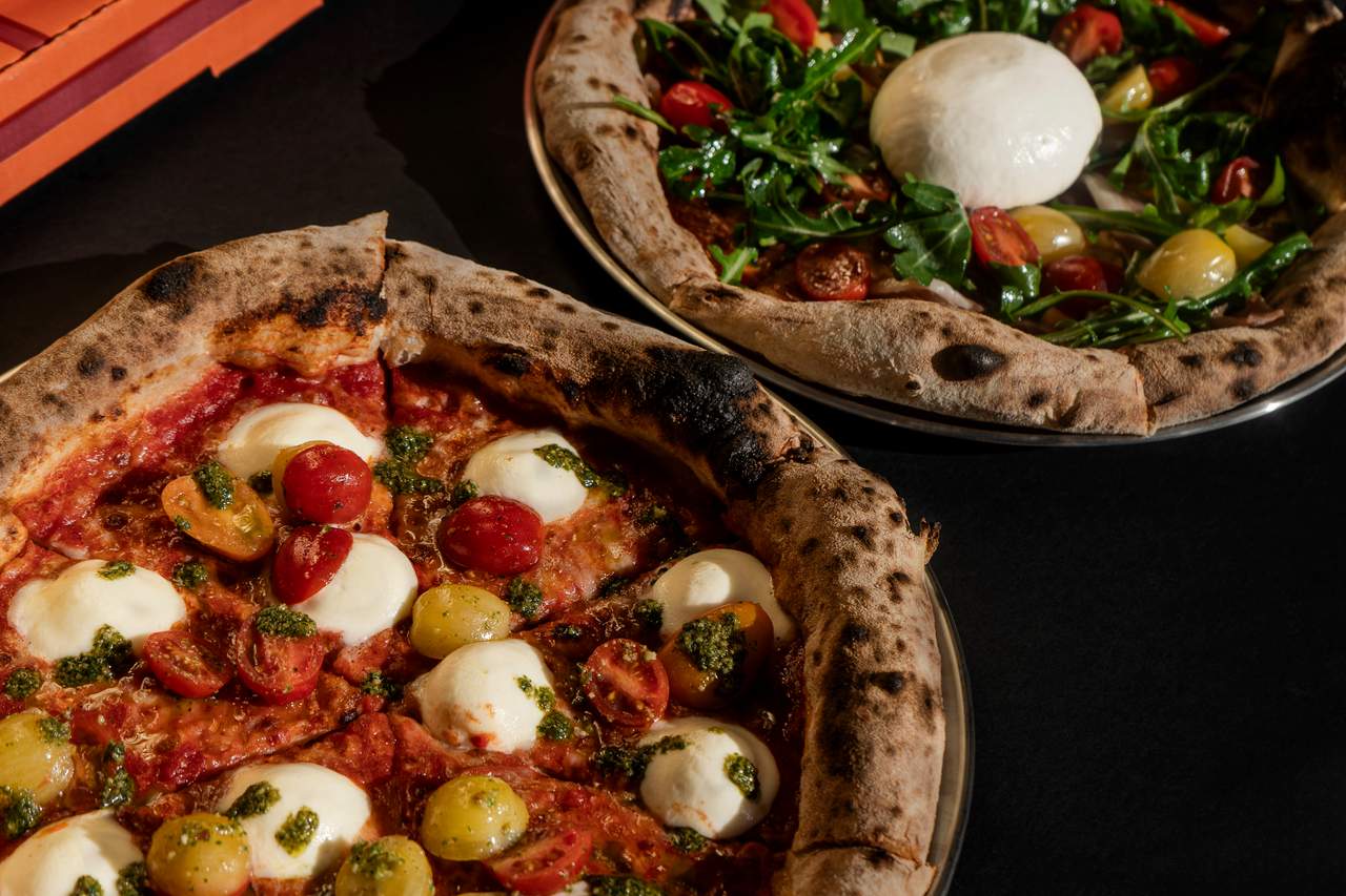 მომწვარი ჰაეროვანი ნეაპილიტანური ცომი,პომიდვრის სოუსი,ჩერი პომიდორი,არომატული პესტო,მოცარელას ბურთები ცხელ ცომში გამომცხვარი.