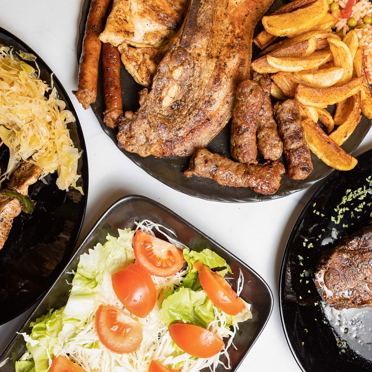 800g miješanog mesa, 4 ćevapa, 2 kobasice, 2 filea pilećih prsa, 2 carska mesa i 2 ražnjića, povrće sa žara, pomfrit i umak po želji