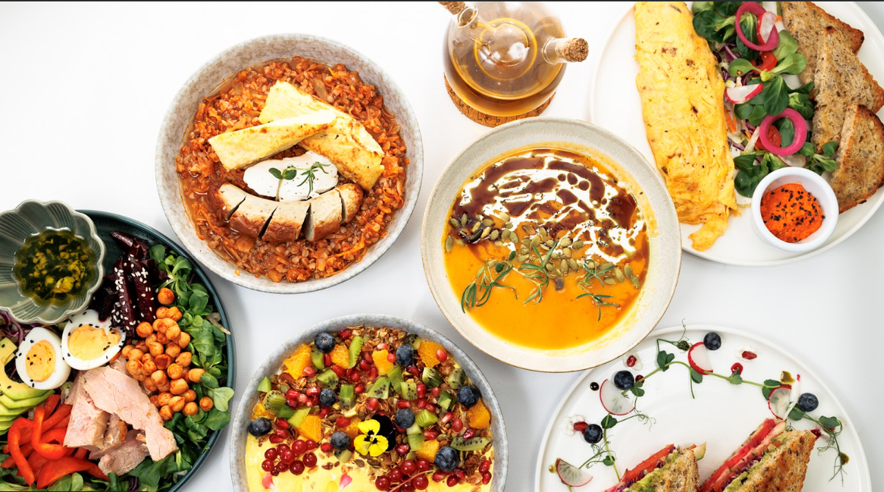 Polpete od povrća iz pećnice, humus od mrkve, salata od bulgura, aromatizirana cikla, kremasti umak od avokada i jogurta bez laktoze, veganski kruh