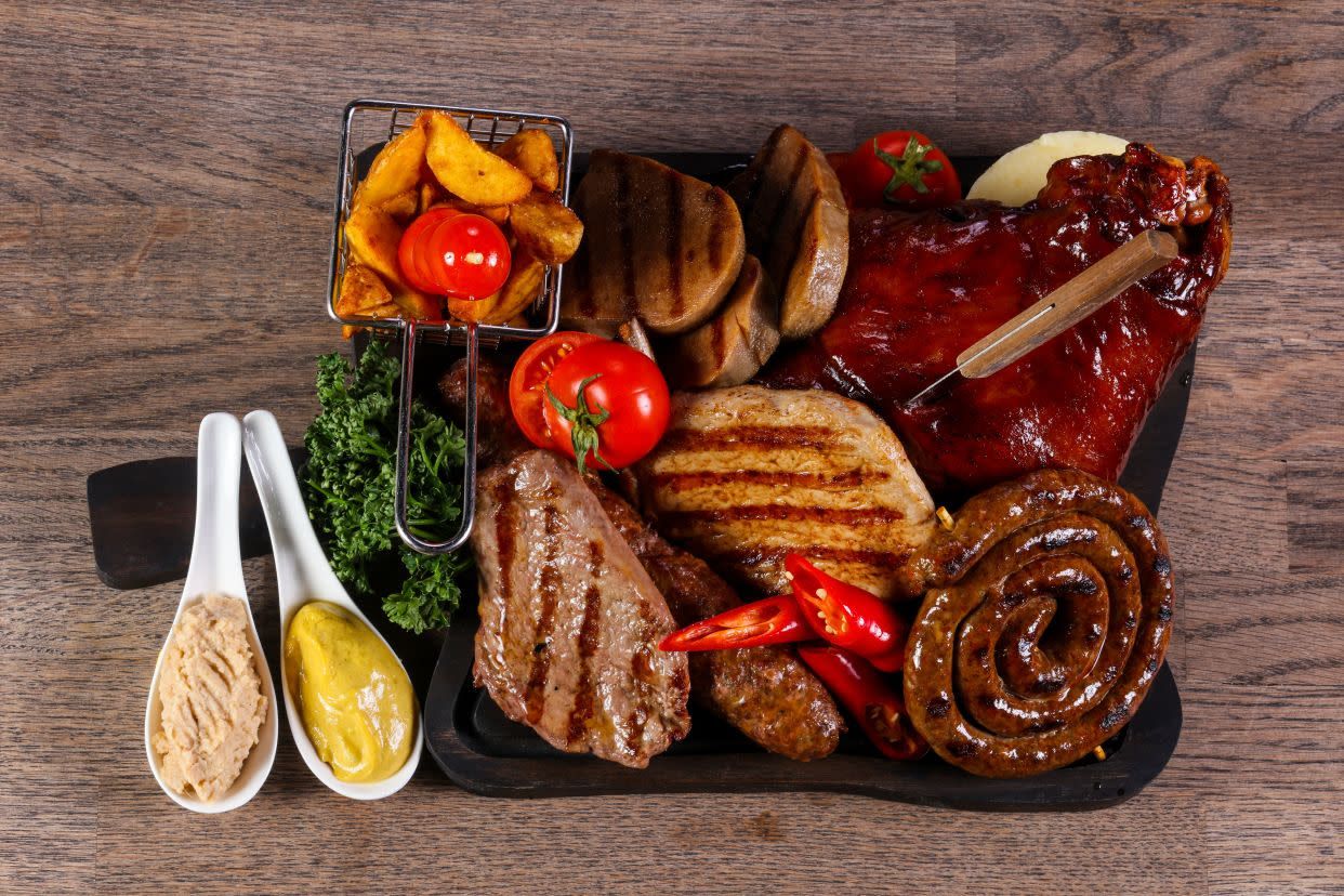 Punjena vješalica 1x, uštipak 2x, ćevapi 6x, svinjski ražnjići 2x, mala pljeskavica sa sirom 1x; prilog - domaći pečeni krumpir, šampinjoni sa žara, prženi luk 6x