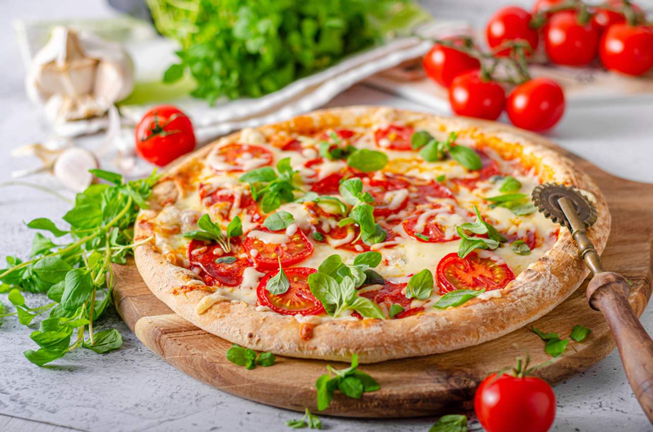 mozz. fior di latte km.0 "Seriate", pomodoro San Marzano, prosciutto cotto, funghi champignon, carciofi, olive taggiasche, origano ed emulsione al basilico