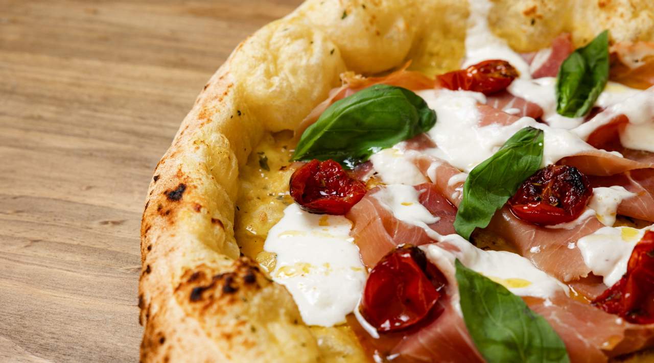 Pomodoro dell'Agro Sarnese, mozzarella napoletana, crudo San Daniele, scaglie di grana, basilico in cottura, olio bio