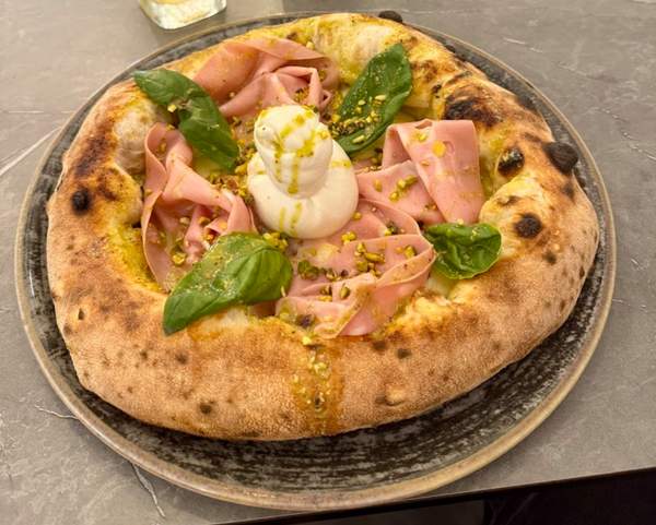 fiordilatte, mortadella, burrata pugliese, pesto di pistacchio, granella di pistacchio, basilico e olio evo