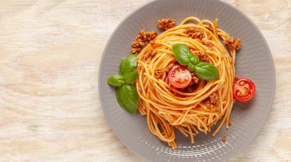 Spaghetti with vegetables in savory sauce