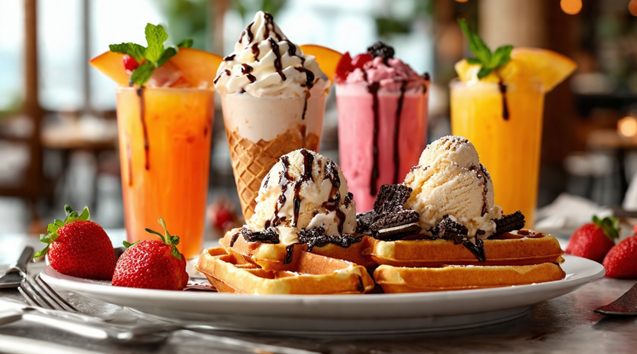 Crisp, golden waffles served warm and topped with a scoop of creamy ice cream, often drizzled with syrup or chocolate sauce