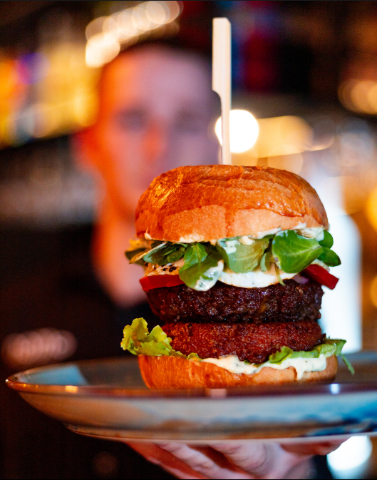 Roślinny kotlet Beyond Meat z serem cheddar, świeżą sałatą rzymską, pomidorem i piklami, podawany w maślanej bułce z sosem burgerowym własnej produkcji. Cena zawiera koszt opakowania. Zdjęcie ma charakter poglądowy.