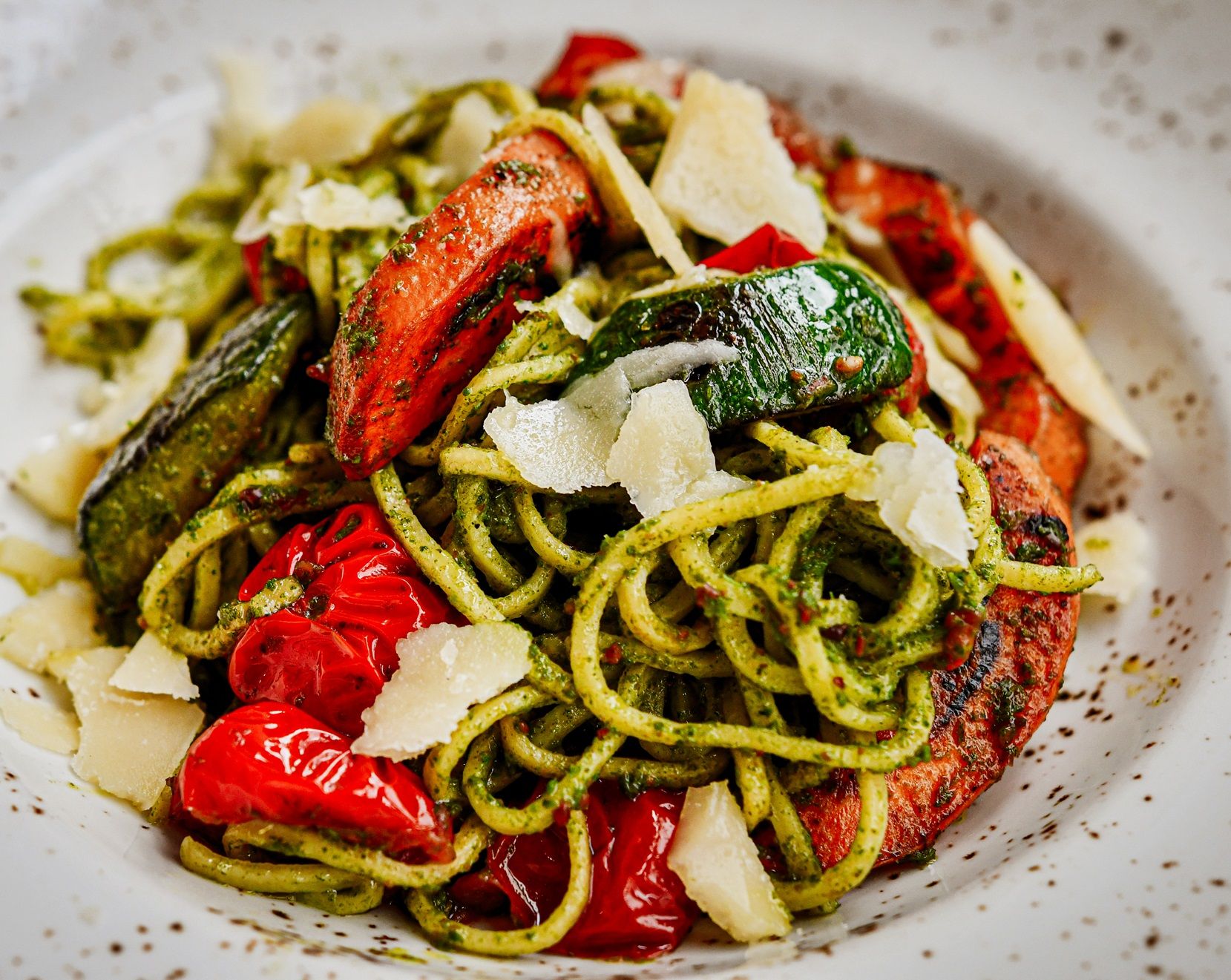 grillowany filet z kurczaka marynowany w ziołąch 100g, sałata rzymska, jogurtowo-ziołowy, grillowana cukinia, bekon, pomidory cherry, parmezan, grzanki