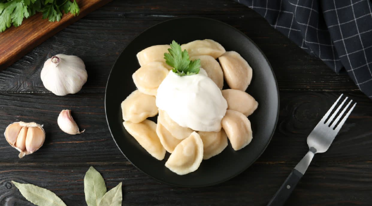 Klasyczne pierogi z gotowanymi ziemniakami, białym serem i cebulką zeszkloną na maśle. Sól, pieprz