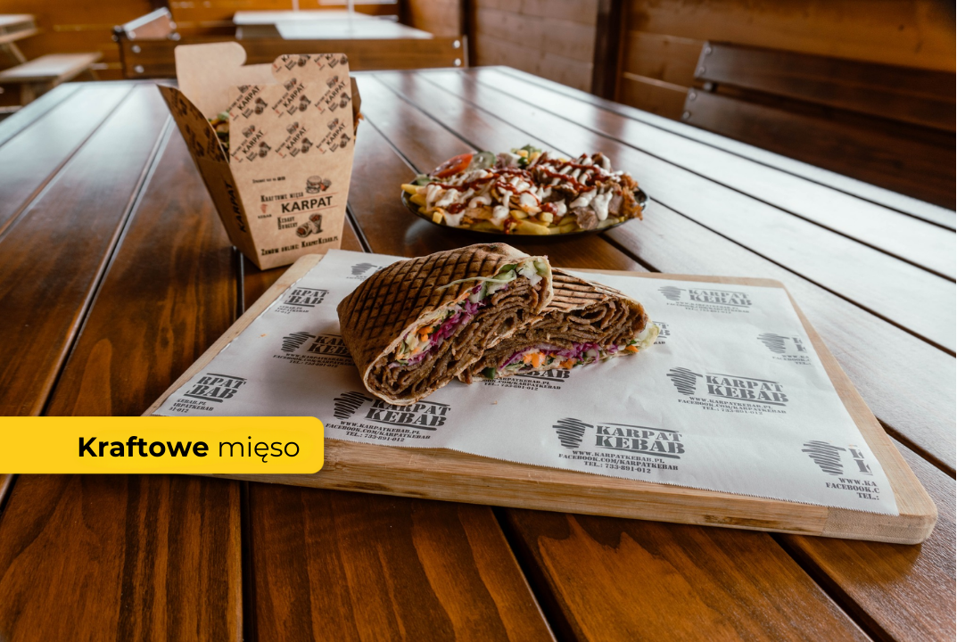 Lawasz własnego wypieku z kraftowym mięsem. Sos do wyboru z dodatkiem sałaty lodowej świeżych warzyw, warzyw gemuse, oraz cebuli.