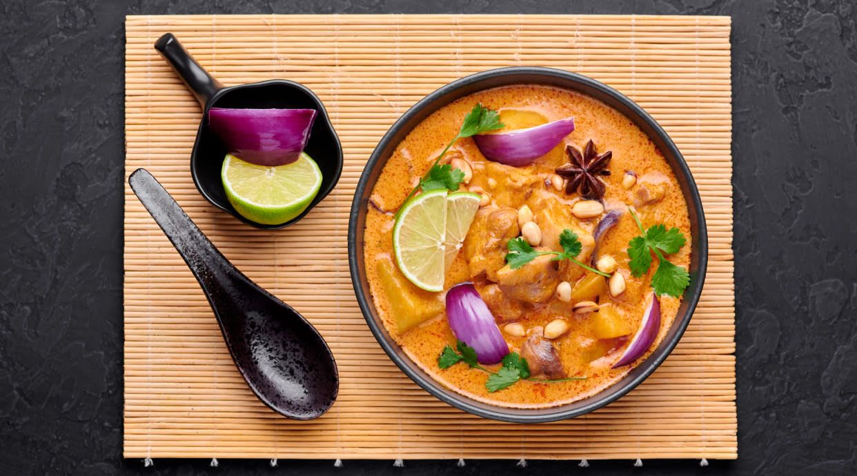 mleko kokosowe z galanga, trawa cytrynowa, ziemniaki, cebula, marchewka, papryka czerwona, orzechy (łagodne)
