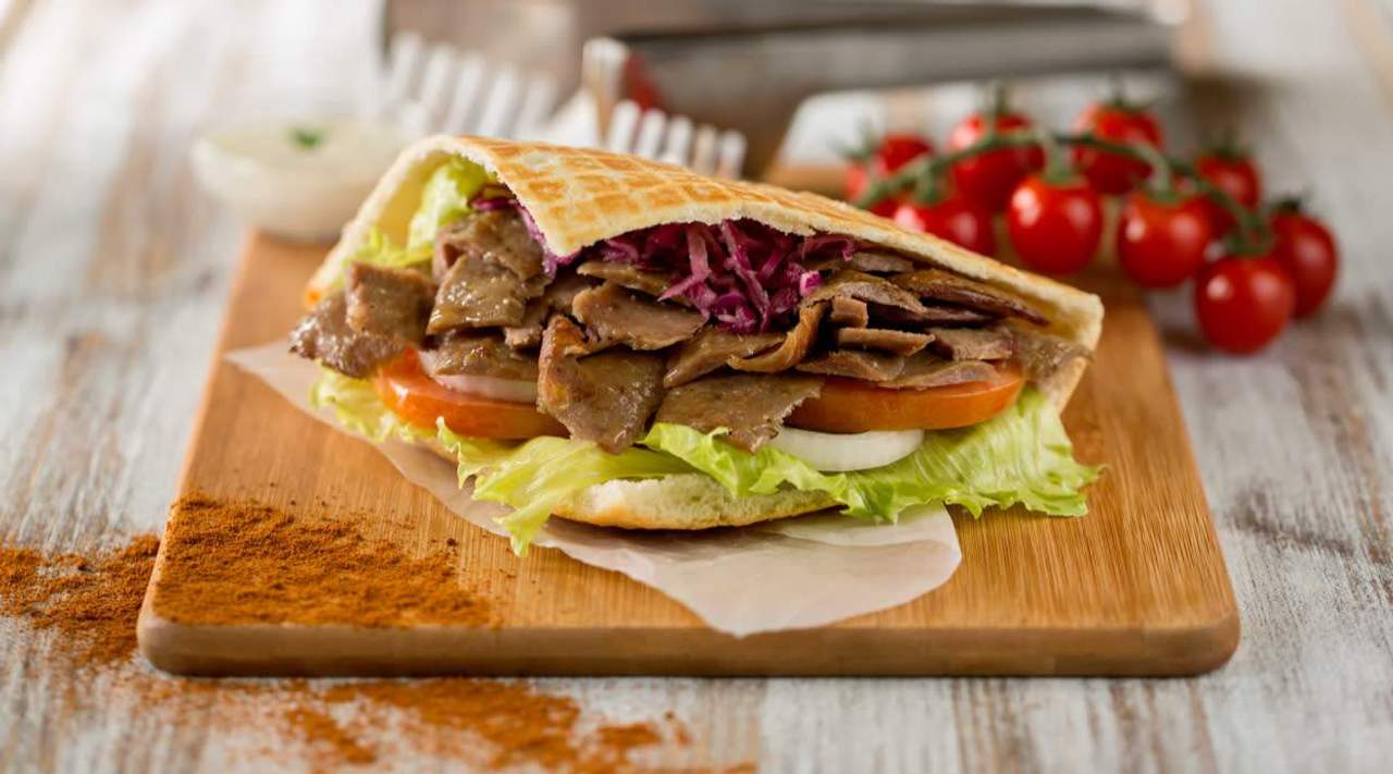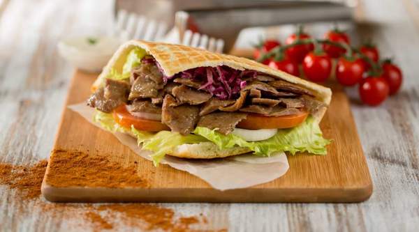 Cienki chleb pita, pieczone mięso, surówka, ogórek, pomidor, sos, pasta czosnkowa; zdjęcie poglądowe