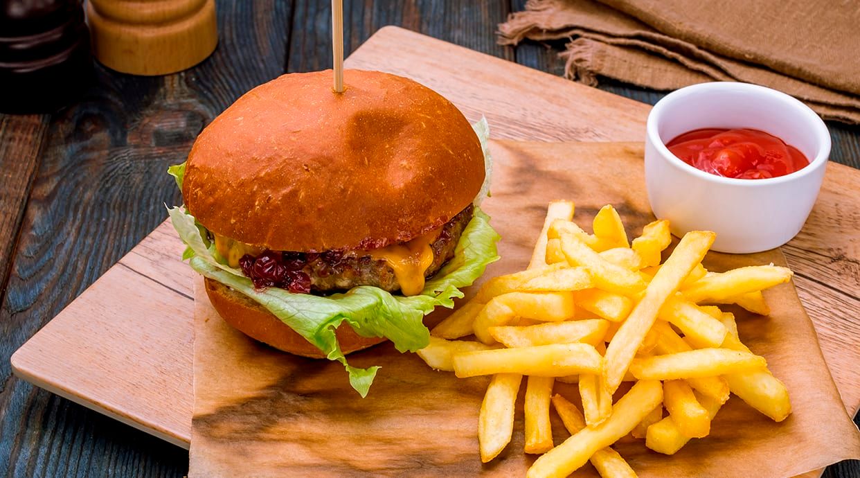 Com batatas fritas e molhos à escolha