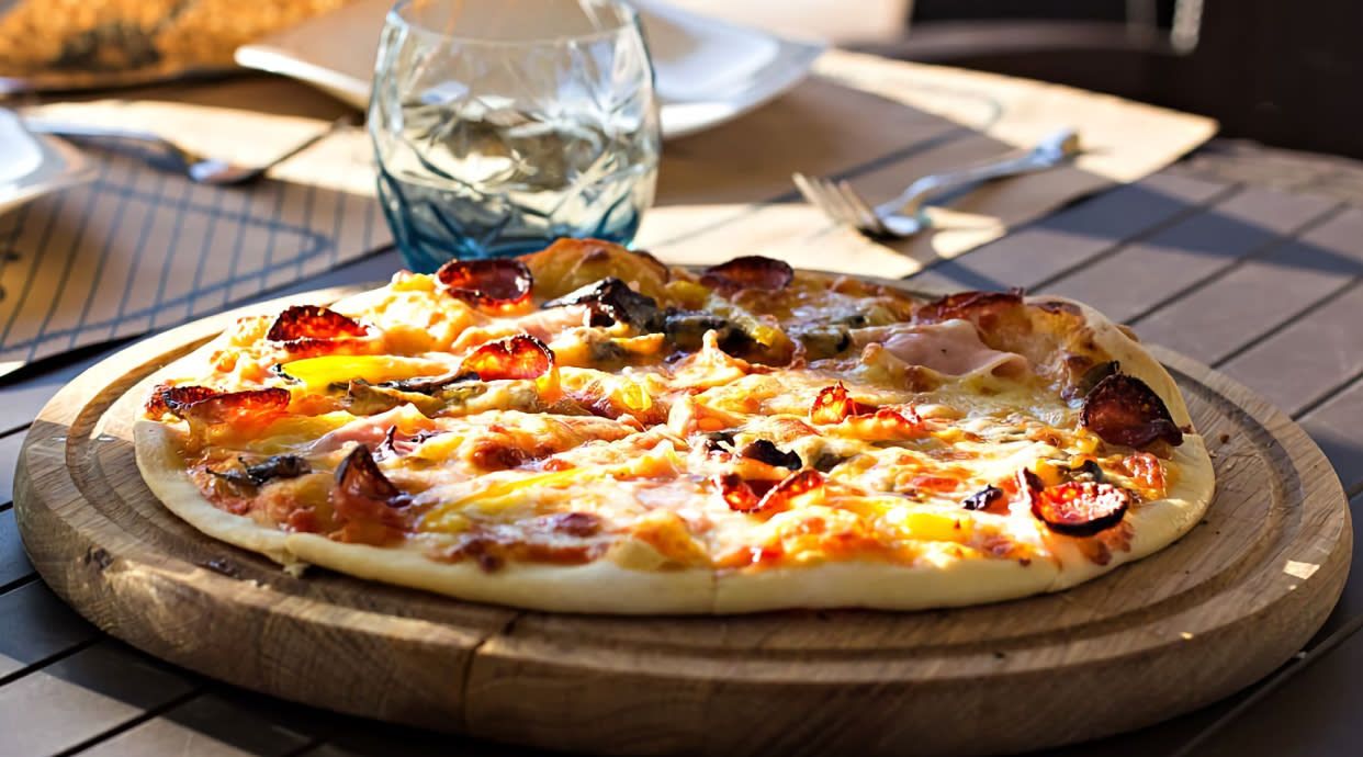 Molho de tomate, fiambre, cogumelos, mozzarella e orégãos