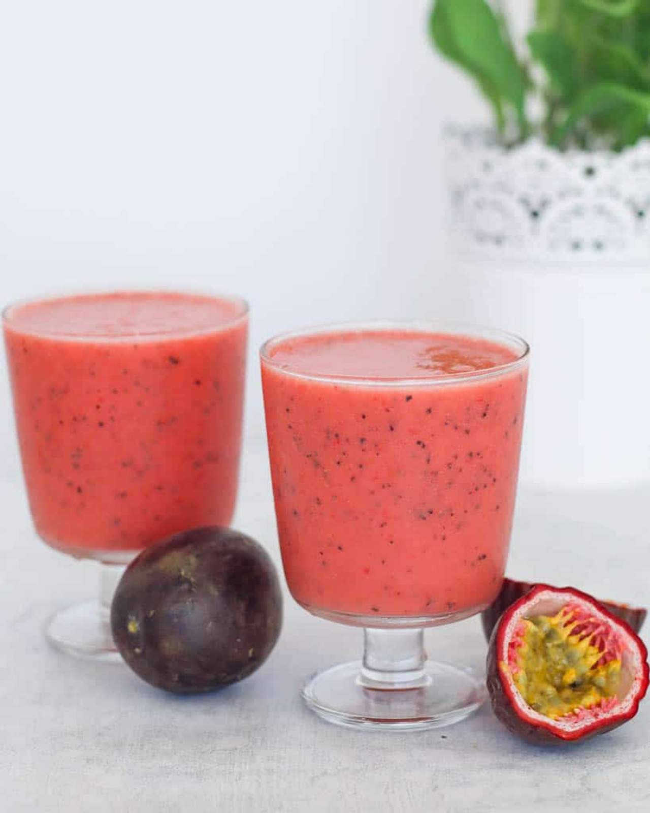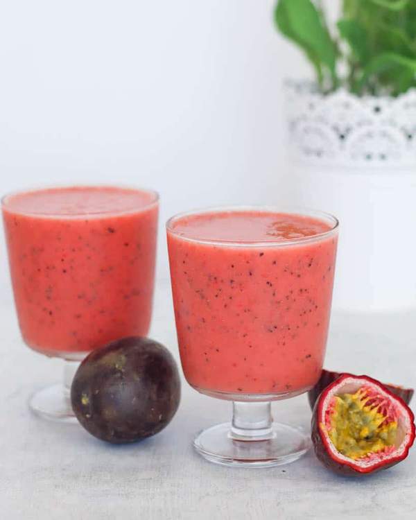 Morangos, maracujá, banana, sumo de maçã, iogurte gelado de morango