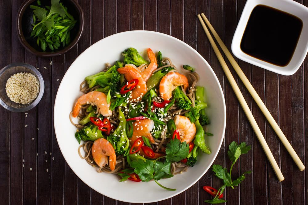 Creveti cu usturoi si taitei de orez