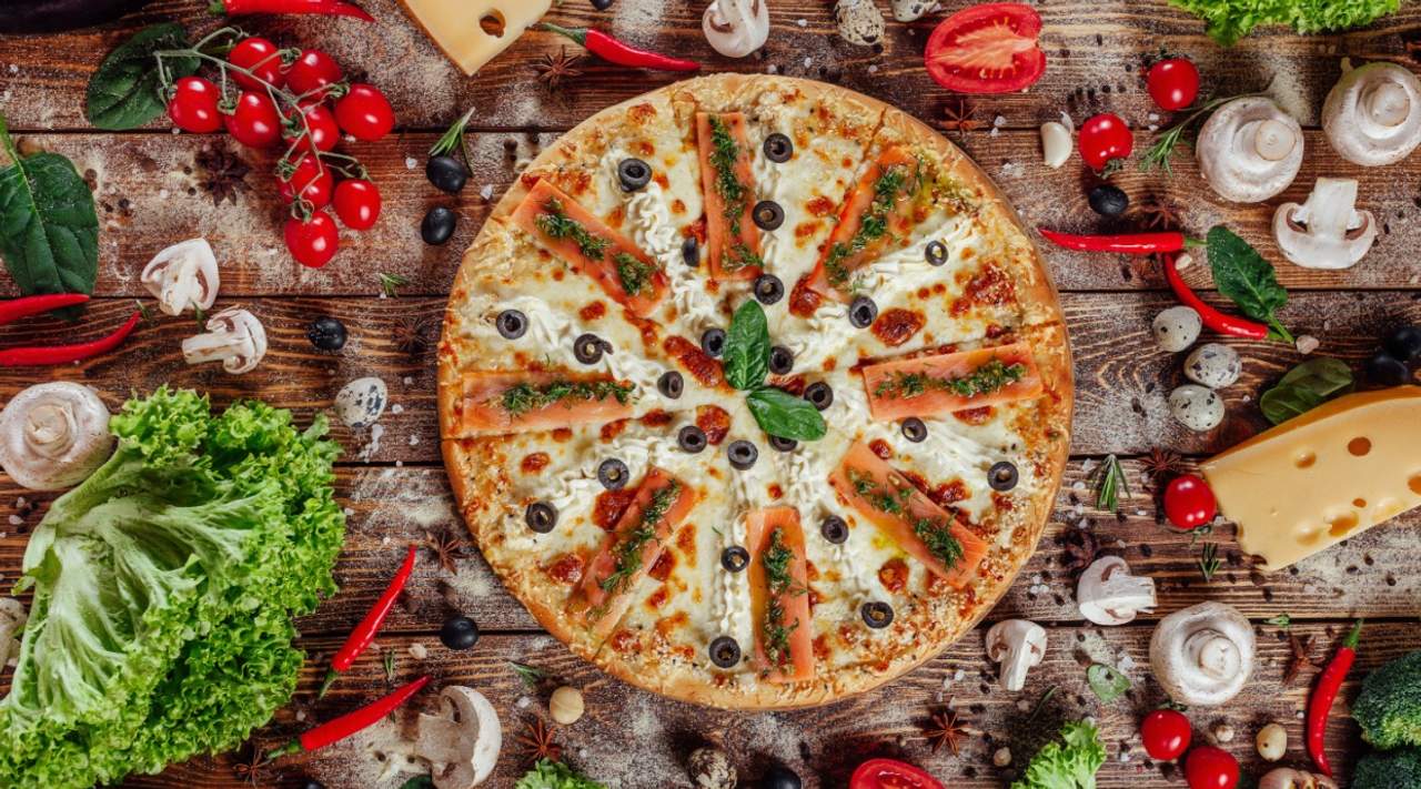Aluat de pizza, sos de rosii san marzano, ulei de masline extravirgin, mozzarella fior di latte, ciuperci, masline, sunca, ardei gras (mare 40cm-450g)