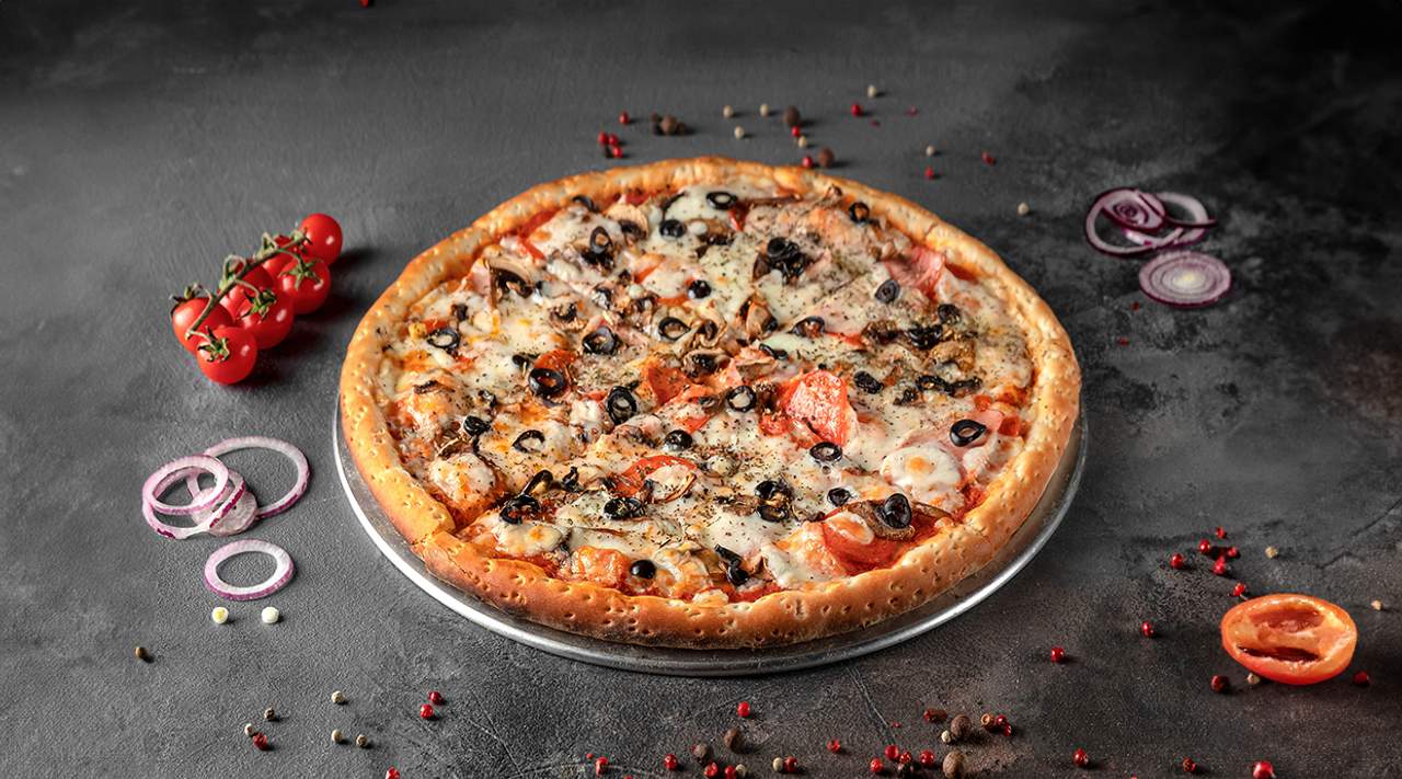 Plat pizza, mozzarella, sos rosii, bacon, salam, carnati, ardei gras, ciuperci, masline - 500g