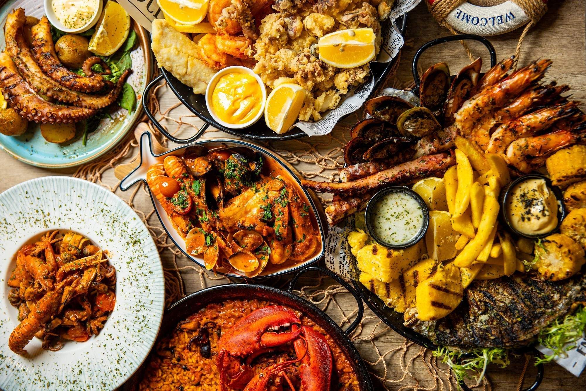 Baby caracatiță, creveți, calamar, carne de scoici, biban de mare cartofi prăjiți, maioneză picantă și sos Alioli - 1.1kg