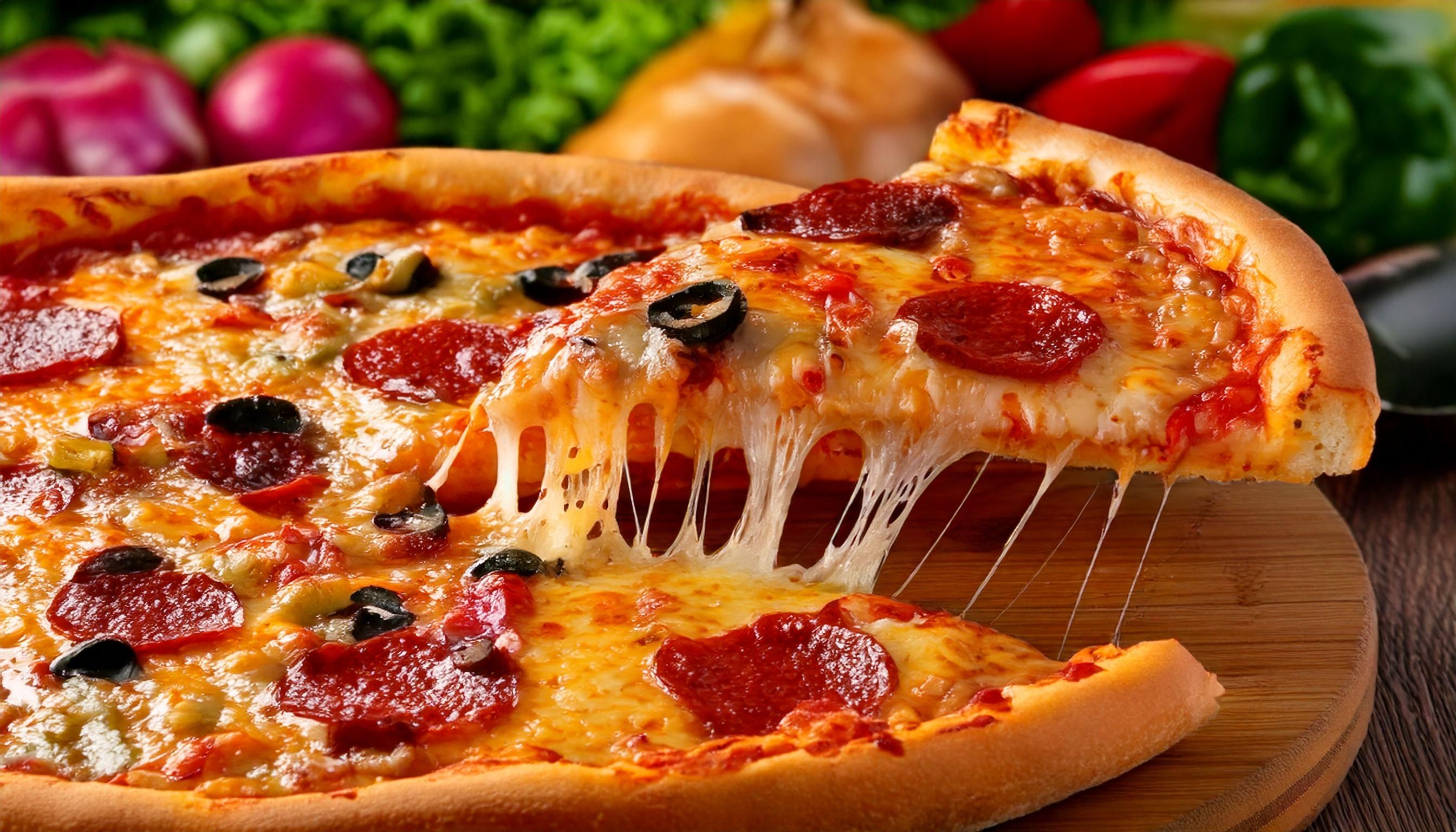 Blat, sos de roșii, mozzarella, salam picant, ardei iute, șuncă, măsline, oregano