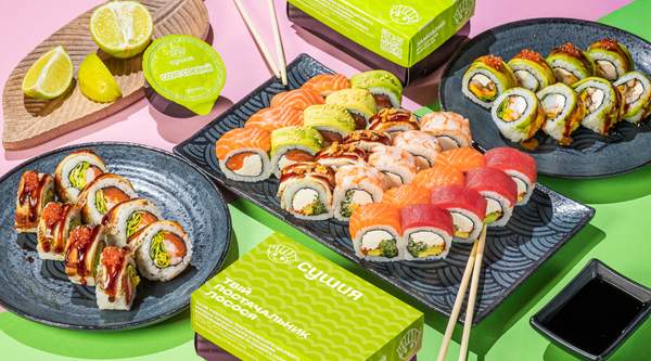 Філадельфія Де Люкс з креветкою та вугрем Філадельфія з авокадо, лососем та червоною ікрою Рол Дабл Фіш з червоною ікрою Рол Пригода Філадельфія гриль грін з лососем Вел Дан Ред рол в червоній ікрі з тунцем Рол Драйв Алергени: риба, ракоподібні, ікра, н