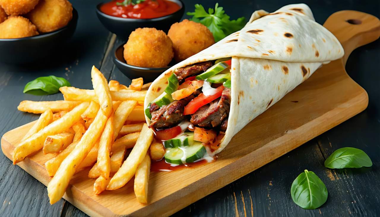 Лаваш кукурудзяний, соус фірмовий часниковий, м'ясо куряче, помідор, огірок маринований, картопля.