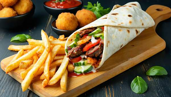 Лаваш кукурудзяний, соус фірмовий, соус пікантний, м'ясо куряче, помідор, огірок маринований, сир моцарелла, картопля, , карамелізована цибуля