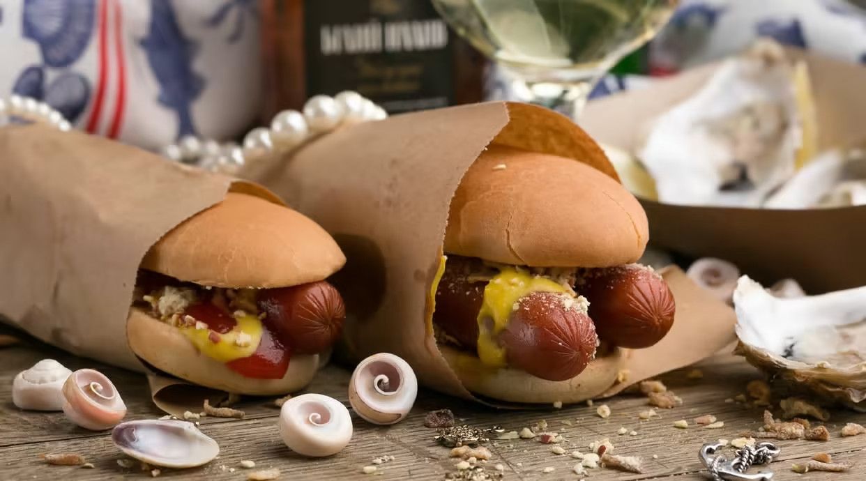 З сосискою з сейтану в класичній булочці, кріспі цибулею та яблуками і трьома класичними соусами