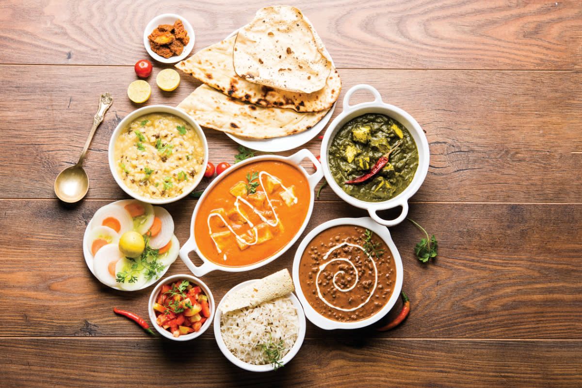 Comes with a choice of rice, one Indian bread, one veg starter and one desert.