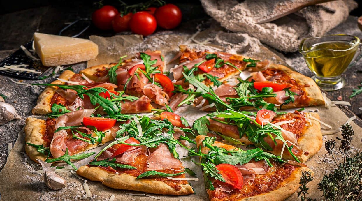 Доматен сос, моцарела, царевица, пилешко роле, топено пушено сирене
