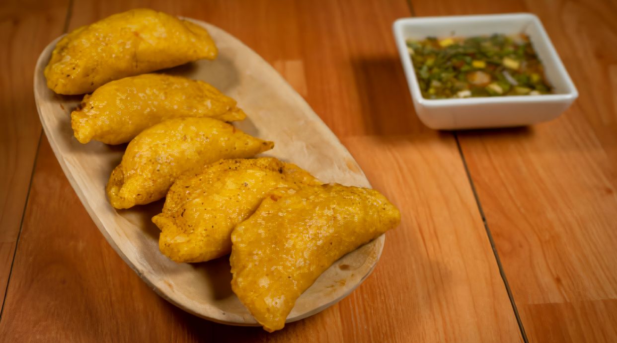 Masa de maíz crujiente rellena de carne de ternera mechada, frijoles negros, plátano maduro y queso