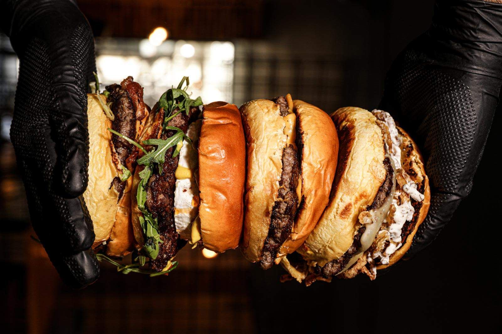 Triple smash burger de vaca madurada Roxa D´ouro dry-aged, triple queso cheddar americano, cebolla encurtida y pepinillos