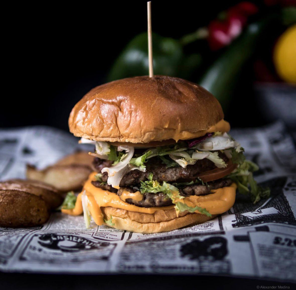 Dos burguers de ternera, bien aplastados en la plancha para conseguir ese dorado crujiente irresistible, todo bien abrazado por un pan de brioche esponjoso y listo para soportar esta obra maestra