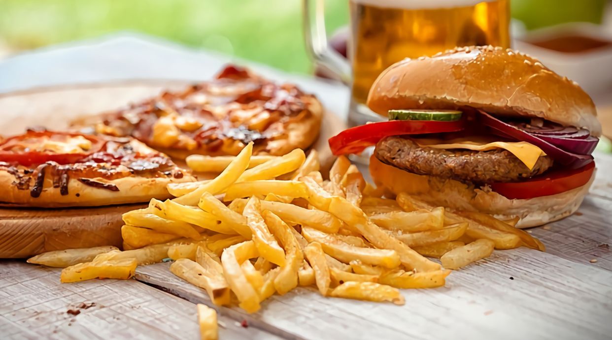 Ternera, patatas fritas, cebolla, lechuga, tomate, salsa ketchup o mayonesa