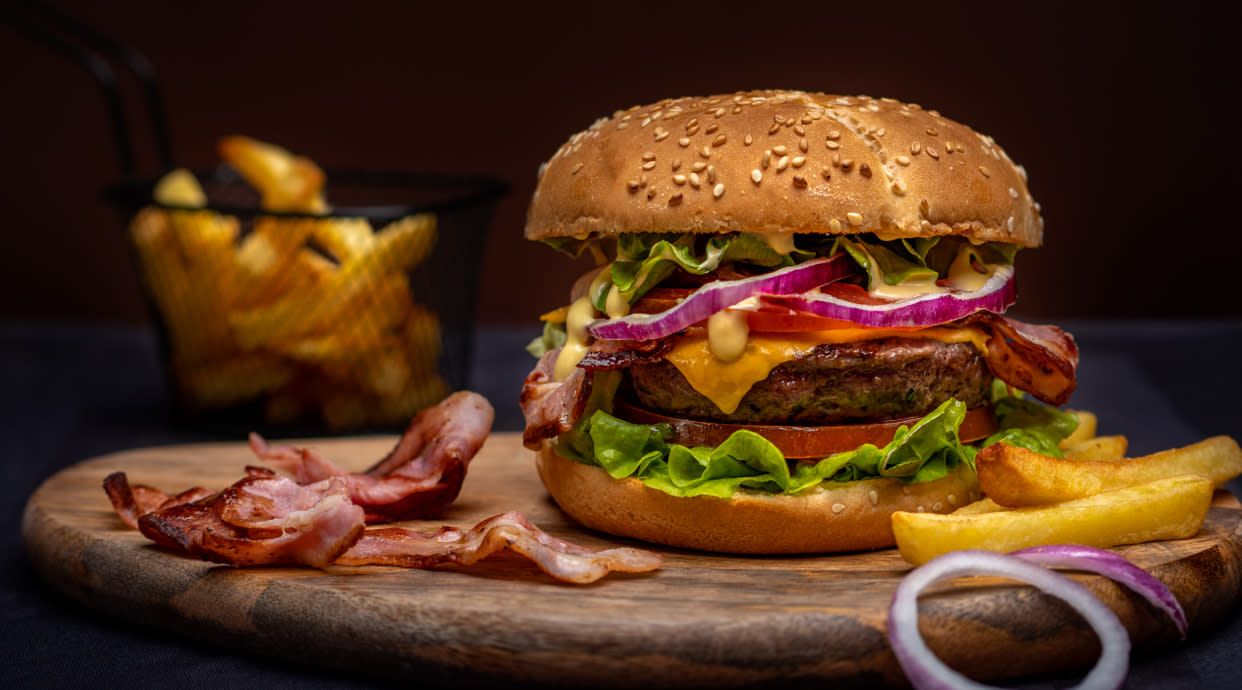 1 patty de 100 g. Cheeseburger de carne de vacuno mayor picada a diario por nosotros. Con bacon, pepinillo pickles y salsa de la casa