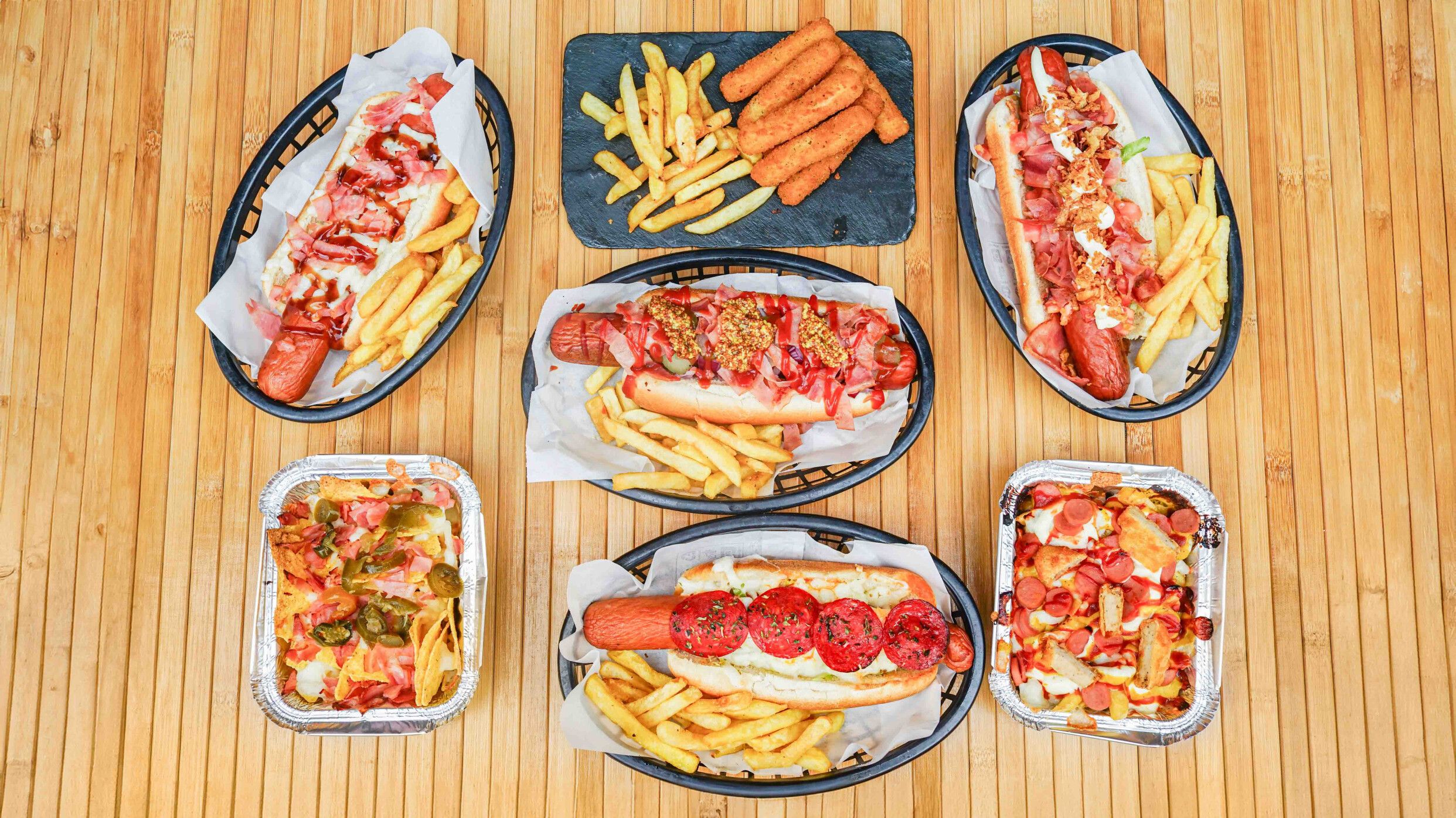 Mahonesa, mostaza, kétchup, salchichas y mozzarella