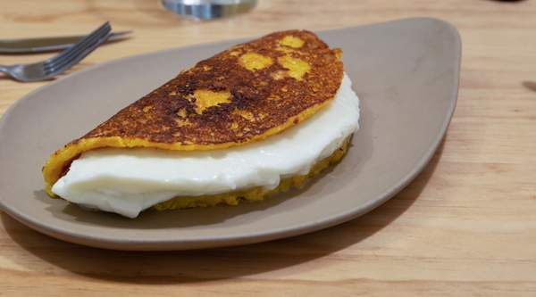 Cachapa maíz tierno(20cm),Queso Mano(100g aprox),Queso Llanero,Nata Criolla (puede cambiar nata criolla por mantequilla colocarlo en notas del pedido),Pollo Deshilachada (120gr aprox). No incluye salsa.CONTIENE GLUTEN, LECHE,HARINA DE TRIGO
