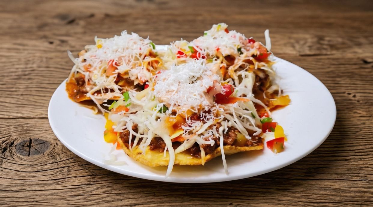 Tortilla crujiente con carne picada, ensalada de repollo, salsa y queso.