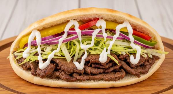 Pan de pita con carne, lechuga, tomate, cebolla, patatas, salsa roja y salsa blanca de yogur