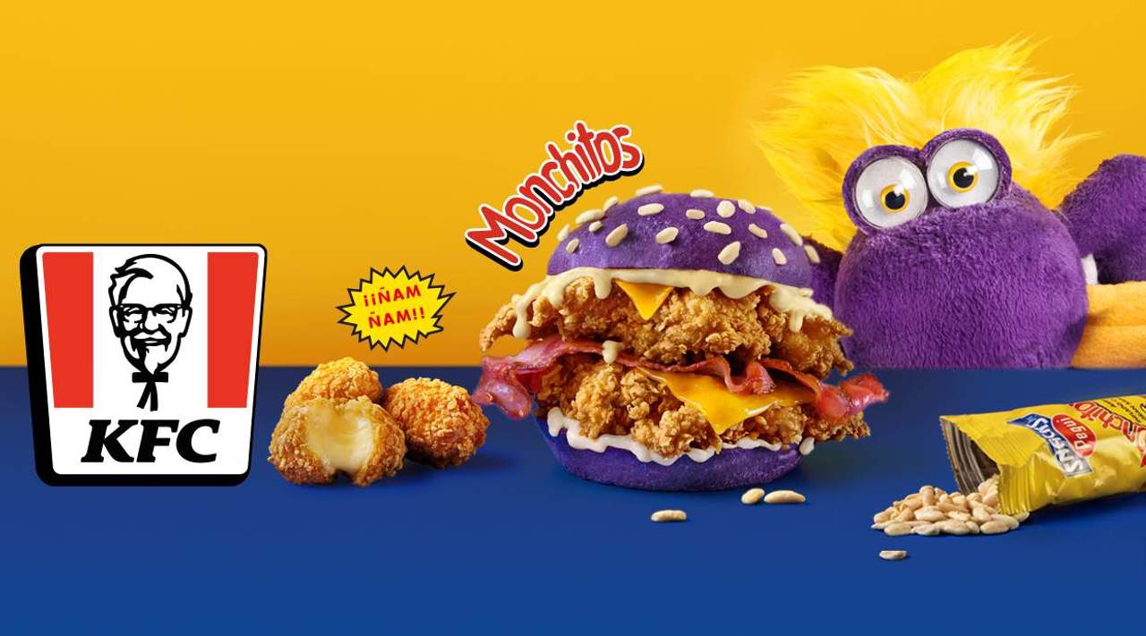 La más monstruosa de todas las Burgers! KFC y Monchitos han creado una Burger con 2 filetes de pechuga Original, bacon, doble loncha de queso, salsa Monchitos, mayonesa y pan morado con arroz inflado.