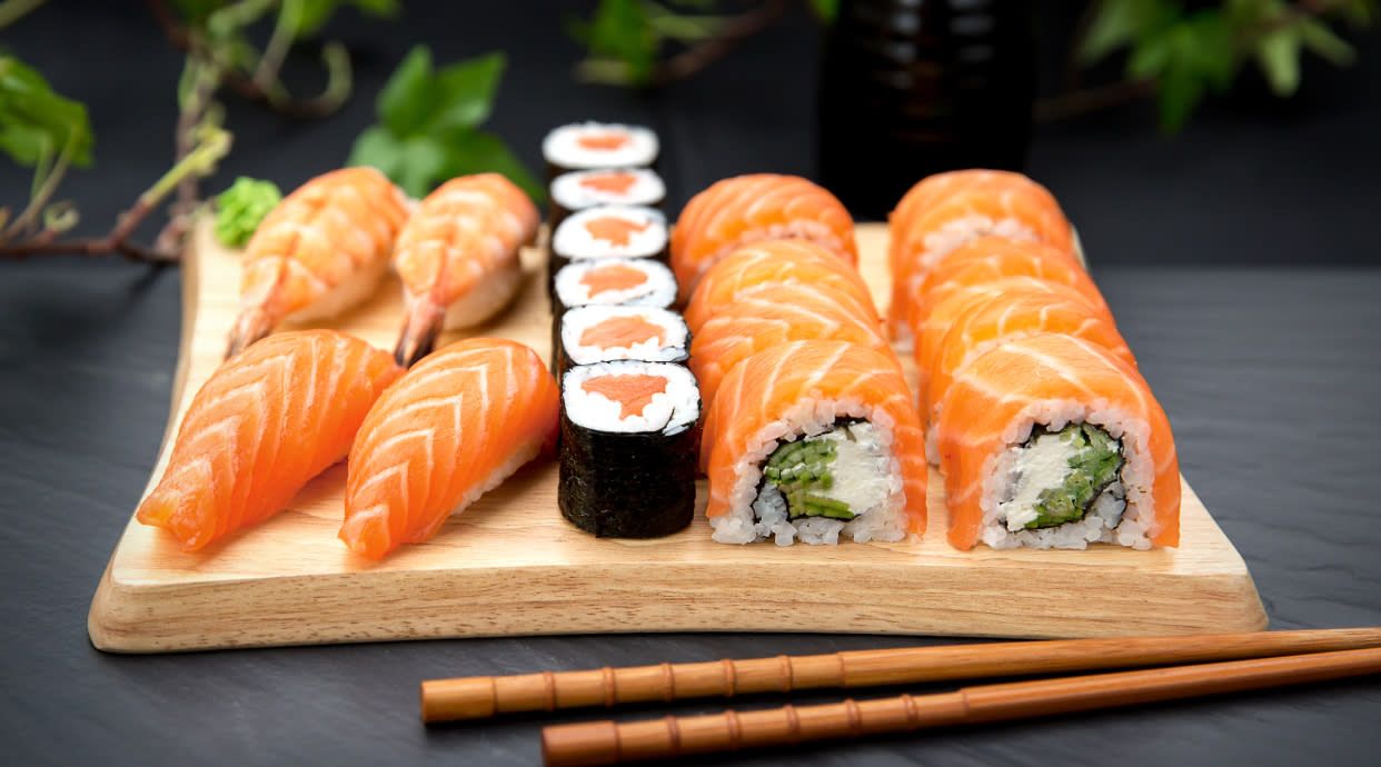 3 Nigiri salmón, 3 nigiri atún, 4 California surimi aguacate, 4 salmón aguacate