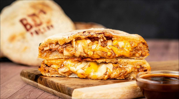 BDC con (150 g.) de cerdo cocinado a baja temperatura, cebolla carameliza con mezcla de quesos y salsa barbacoa, envuelta en masa crujiente y ligera